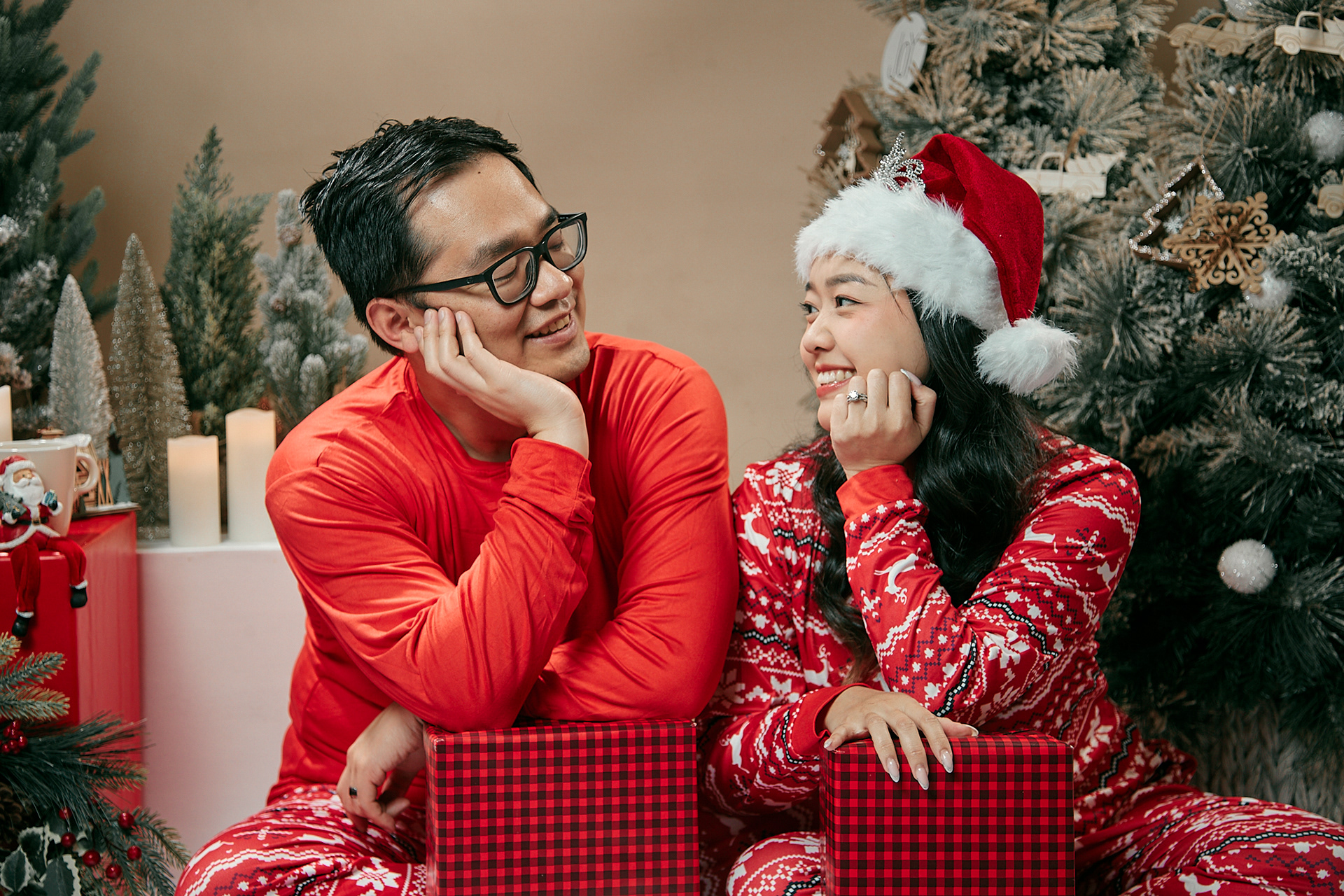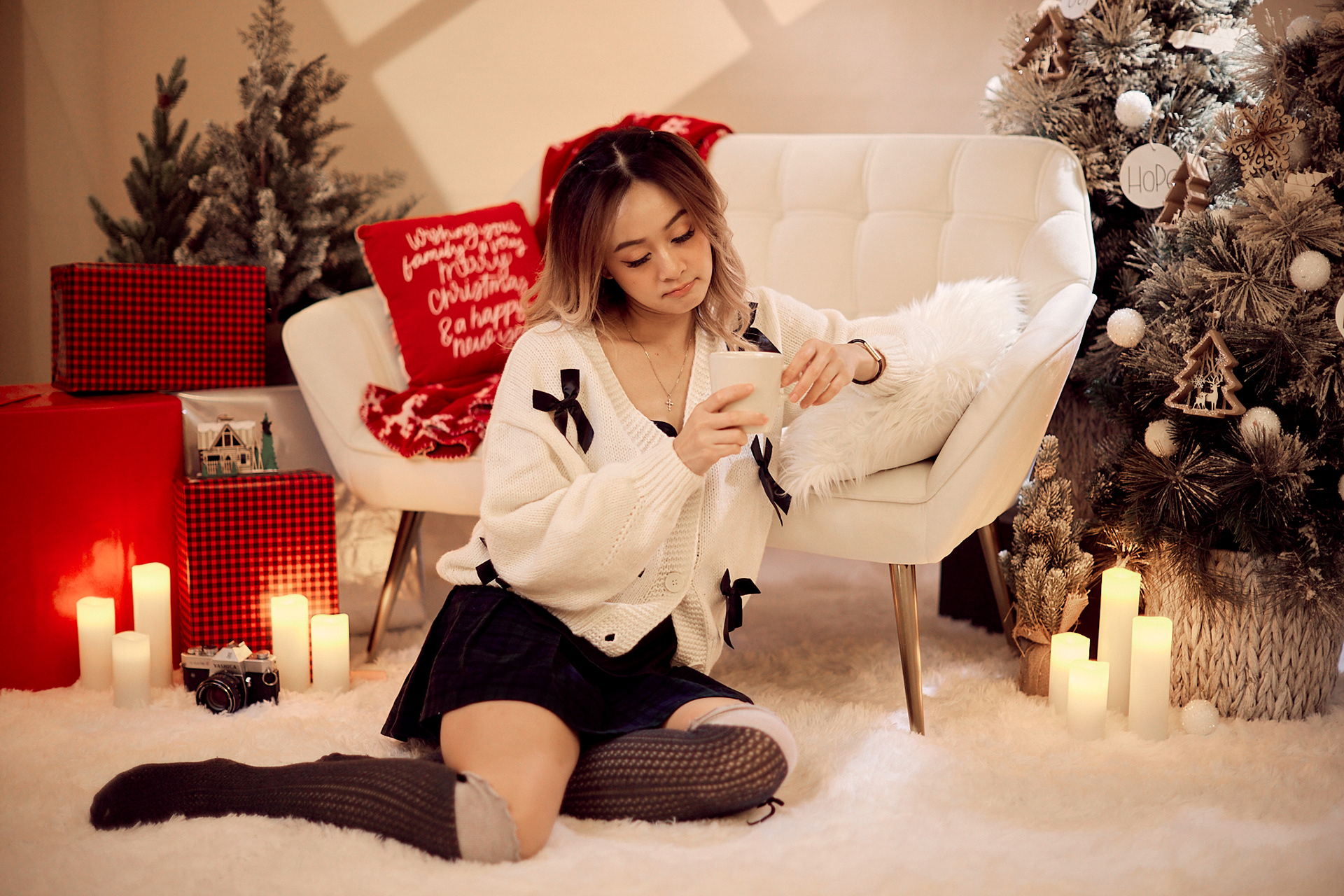 Stunning Christmas-themed sets filled with festive decor, cozy lighting, and holiday cheer